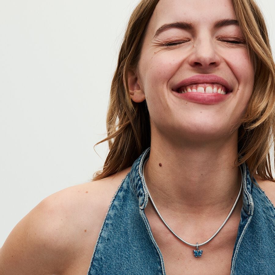 Transform into your best self with the Blue Murano Glass Butterfly Dangle Charm. This hand-finished sterling silver charm features Murano glass wings in a bicoloured blue gradient with a cut-out sterling silver pattern on the back that shows through the glass, and sterling silver swirls on the front. Microbeads on the butterfly's body and pavé on the bail add a touch of delicate detail and sparkle. Add this blue butterfly to your styling as a powerful symbol of hope, transformation and new beginnings. (792698C01)