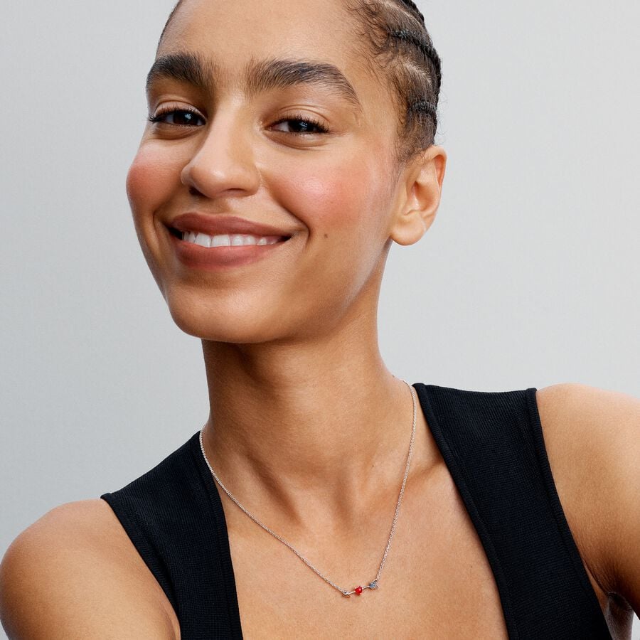 Play Cupid with the sterling silver Arrow & Murano Glass Heart Necklace. Featuring a red Murano glass heart at the center of a Cupid's arrow, this necklace sparkles with four clear cubic zirconia stones along the arrow's fletching, forming a universal symbol of love. Wear it alone or layer it with other necklaces for a personalized stack. With an adjustable length of 40, 45, or 50 cm, it's perfect for any neckline.